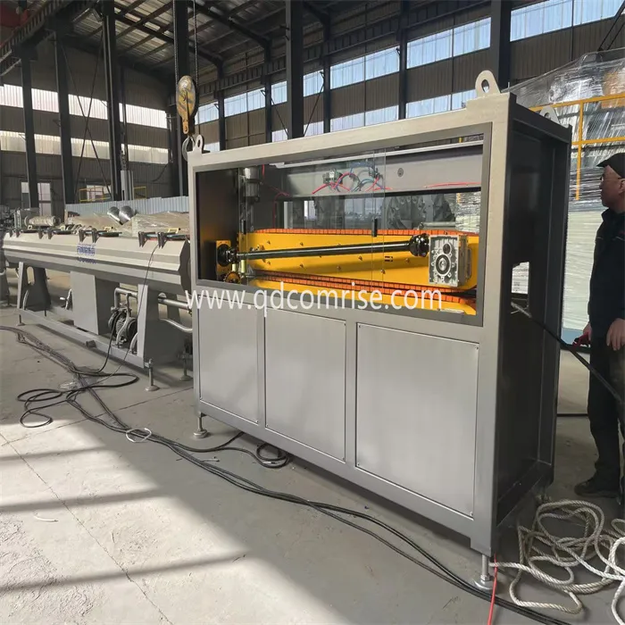 একটি নিয়ন্ত্রিত গতিতে উত্পাদন লাইনের মাধ্যমে পাইপটি টানছে।